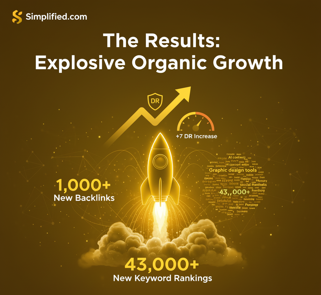 Simplified.com, a rapidly growing AI-powered design and marketing platform, partnered with Rank.co.com to significantly increase its organic footprint and online authority. Operating in the hyper-competitive SaaS market, they needed results that were both fast and impactful. In a short period, our team successfully increased Simplified’s Domain Rating (DR) by 7 points, acquired over 1,000 new, high-quality backlinks, and secured rankings for over 43,000 new organic keywords.